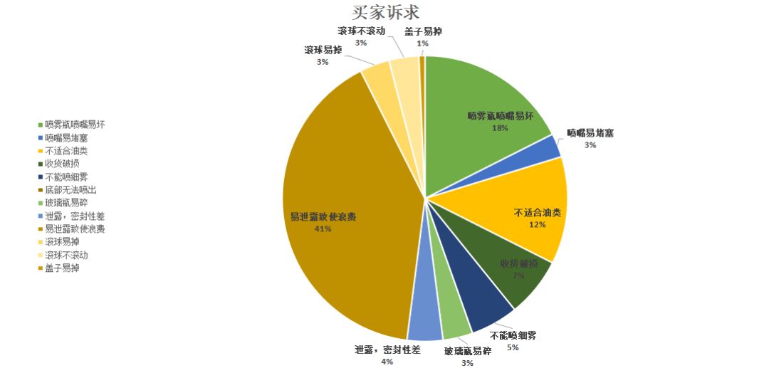 硅胶挤压瓶和滚珠瓶主要差评来自于泄露问题,占比较大;喷洒瓶其一喷口易堵塞或出问题,导致不能正常喷雾;其二在于很多买家反馈不适用于油类产品,特别是在厨房或烧烤时,如橄榄油,不能顺利喷出,引来买家不满。其共同存在的小问题主要为用不完瓶壁残留易浪费等,还有清洁问题也是需要考虑的一大因素。