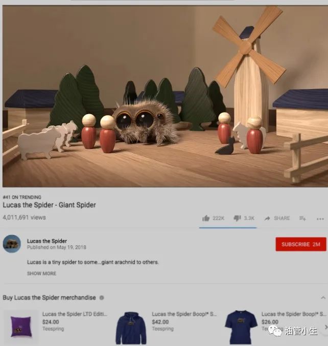 早在2018年,YouTube就为推广商品的创作者提供了“货架”功能,以便创作者可以在视频下方展示其产品。以下是著名的“卢卡斯蜘蛛”的油管频道,大哥看看当时他植入的电商相关功能。YouTube测试在视频下方添加带有定价的产品购物链接,让用户可以一键跳转到购物页面。