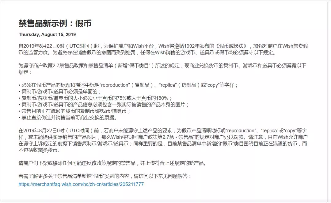 UTC时间2019年8月22日0时开始,任何在Wish平台销售的游戏币、道具币、假币都需要遵守相关的规定: