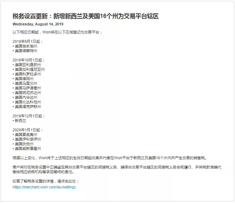 2019年9月1日到2020年1月1日不等,Wish将在美国16州及新西兰被登记为交易平台: