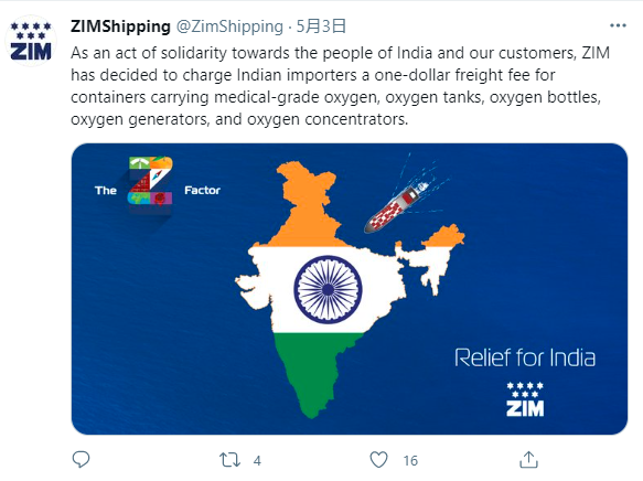 运往印度的医疗氧气类设备及救援物资“免”海运费!