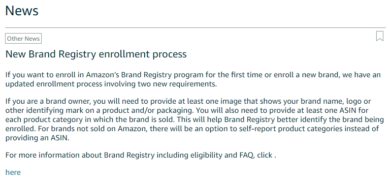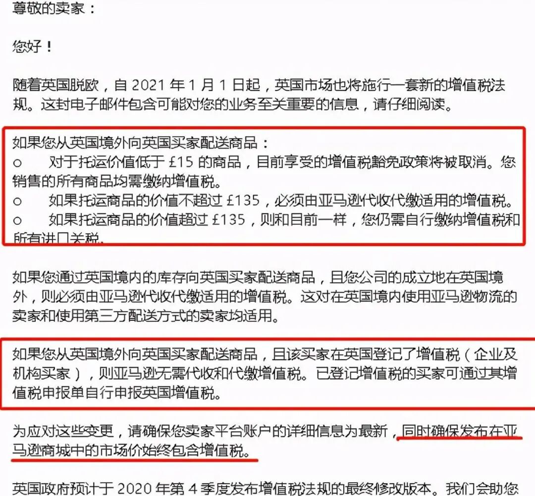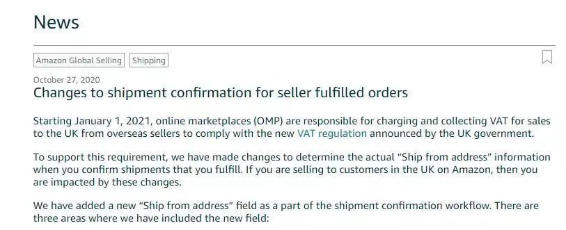 亚马逊发货政策变动 为方便亚马逊平台代收代缴英国站 VAT,亚马逊有针对性出台了关于卖家上传发货地址的政策。 该政策表示,为了履行税务局的代收代缴 VAT 要求,平台需要收集卖家的发货地址。 平台会在卖家确认发货流程中加入“发件人地址”的文字信息,在卖家自发货订单点击确认发货时,需要实际填写该地址信息。地址信息的填写,不仅是在卖家后台订单的确认发货时填写,还会在提交运输模板、使用第三方 API 接口确认发货时填写。 这个填写变化,将在 11 月底上线,目前卖家还有一个月的时间做准备。明年 1 月 1 日,政策会开始强制执行,如果不填发货地址的订单则将无法确认发货。 亚马逊将代收代缴VAT 亚马逊代缴 VAT 一事是近期跨境圈内关注的热点。 因为英国脱欧一事,亚马逊对英国站的增值税做出了以下规定: 该政策会在 2020 年 1 月 1 日起,对账号注册公司主体是英国境外公司,英国站的 VAT税费全由平台代收代缴。卖家 FBA 仓库不在英国,但往此销售,也适用该政策,除非托运商品价值超 过 £ 135 。 另外,早在这篇文章中《亚马逊将直接代缴 VAT,欧洲站卖家炸锅了!发生了什么?》社长对此事进行了详细解读,还不够了解的卖家可以点击查看详情。 11月6日新的交流指南政策生效 亚马逊曾在一个月前出台过交流指南政策,此前生效的时间规定于今年的 11 月 3 日,但改动后推迟到了 11 月 6 日。 新的交流指南政策公告如下: 更新后的卖家和买家交流邮件中不能包含以下内容: 1、解决买家问题所需的(比如出货标签、发票、定制设计)以外的附件 2、电子邮件地址 3、与保修、运输供应商、制造商无关的电话号码 4、链接指向的没有解释性文本的可访问性问题(解释性文本举例:单击此处查看保修信息)或者没有替换文本的图像或图形 5、表情包(含图释符号) 6、动画GIF 7、过分的拼写错误或语法问题 相对于之前被很多卖家吐槽的:邮件中不得包含电话号码、不能有拼写错误的严格规定来说,新的交流指南放宽了很多。 本月即将实行的政策,卖家们还是按照规定和买家沟通,如果违反了这几项要求,卖家和买家的沟通权限可能会被亚马逊限制,甚至被暂停亚马逊店铺的销售权限。 TM 商标可以备案了! 前些日子,亚马逊推出商标备案政策 :Pending Trademark Mark. TM标 可以进行品牌备案,这对很多卖家来说是个好消息。不过亚马逊通知 TM 标进行品牌备案有三个要求: 具体的备案流程,社长在这篇文章有详解,大家有需要可以查阅收藏。 亚马逊品牌政策更新 从近几年的销售趋势看,亚马逊一直做品牌路线的策略。在本月,亚马逊对品牌的注册进行了政策更新。 亚马逊规定有两项要求: 1、如果卖家是品牌所有者,则需要提供至少一张图片,在商品和/或包装上显示您的品牌名称、徽标或其他识别标记。 2、卖家还需要为销售该品牌的每个商品分类提供至少一个 ASIN。这将有助于亚马逊品牌注册更好地识别正在注册的品牌。对于未在亚马逊上销售的品牌,卖家可以选择自行报告商品分类,而不是提供 ASIN。 品牌政策的两个新规定,无疑是增加了卖家品牌注册的门槛,也是亚马逊为提高卖家群体质量的目的,在大趋势下,品牌也会越来越重要。 亚马逊“FBA库存年龄”新功能 本月,亚马逊还推出了“FBA库存年龄”新功能。 该功能可以帮助卖家按照库存年龄对产品进行筛选,进而看清库存过久的产品;另外还能通过改善销售率,来帮助卖家提高销售量,并避免长期仓储费,降低成本。 亚马逊还提示卖家可以通过以下方式,对该功能进行操作: 具体 · 操作 1.进入FBA库存年龄,并单击并点击库存年龄过滤器 2. 选择一个年龄范围,查看哪些产品在该范围内至少有一个单位 3. 单击每种产品年龄范围下方的详细信息,可以查看该范围内的产品数量 4. 选择了年龄范围后,可以使用“库存年龄”列标题旁边的向下箭头按升序或降序对产品进行排序 亚马逊还表示,卖家在旺季期间,可以使用该功能来维持90天连续销售率的健康增长。