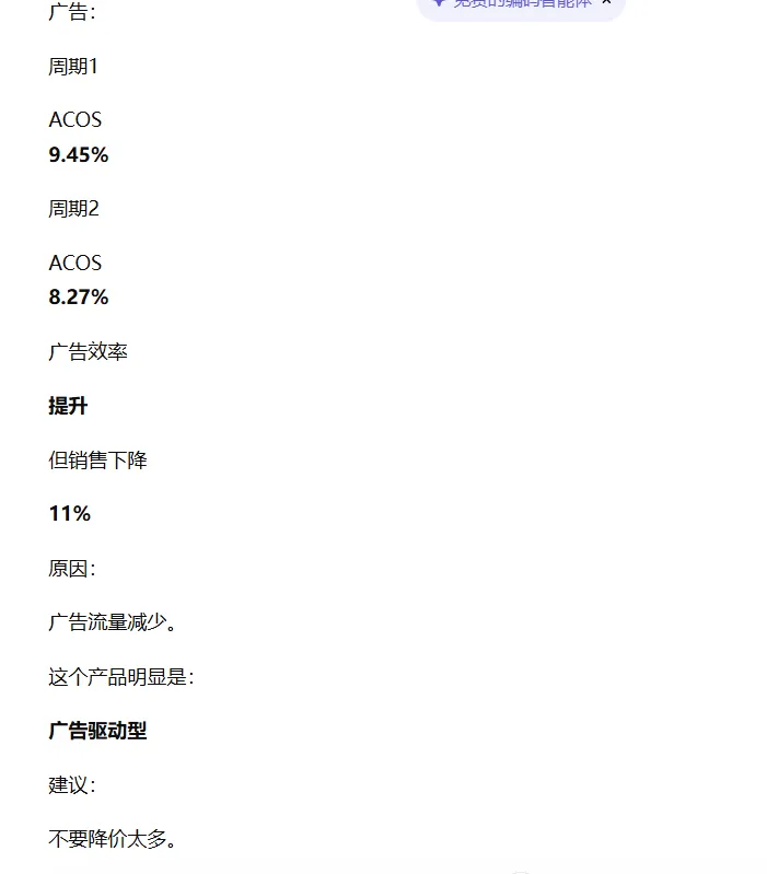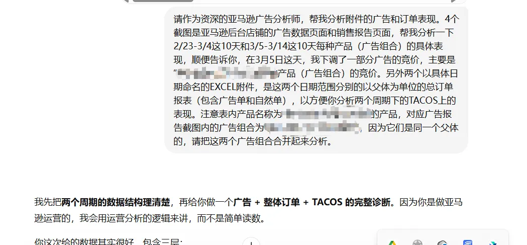 当然,如果我再把更细节的关键词报表、广告位报表,甚至关键词广告位监控表发给AI,相信能有更值得参考的建议出来。