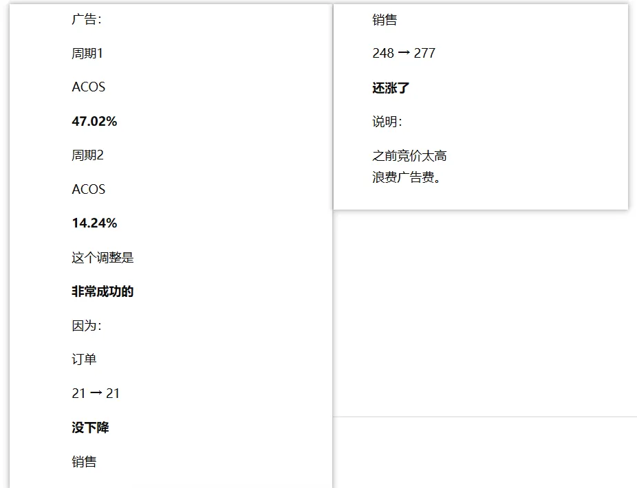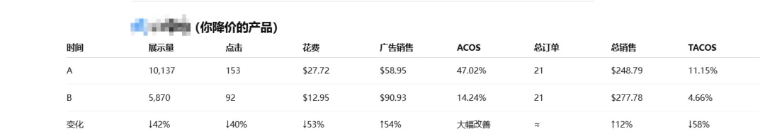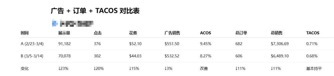 结论是,调整效果不错,花费下降带来了展示量和点击量下降,但因为转化率提高了,广告订单反而多了,总销售额也随之提升(出单产品中高客单产多了点)。TACOS很漂亮。