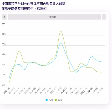 报告指出,近几个月来,全球和某些国家的购物应用内购买(IAP)下降似乎是许多行业经济放缓的结果。但在第四季度假日季节,购物APP IAP将迎来高增长时期,尤其是在11月,并且iOS的峰值高于Android。