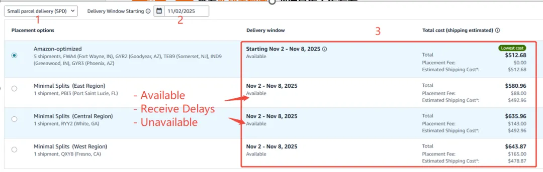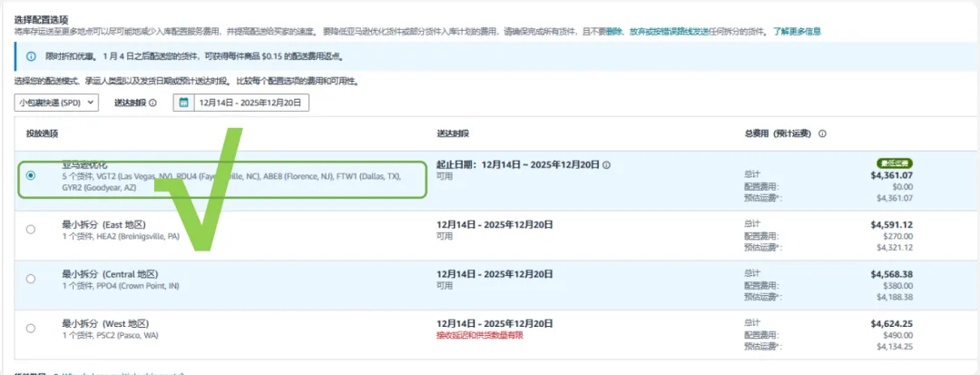 系统将列出所有可用的入库选项,并清晰标注各选项对应的仓库区域、代码、入库配置费及预估运费。卖家可直观比较总成本,选择最优方案。