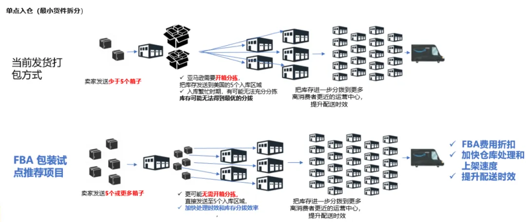 简单来说,每个SKU需分装至少5箱,且每箱内容完全相同。这有助于亚马逊将库存高效分布至全美多个区域,提升配送时效。