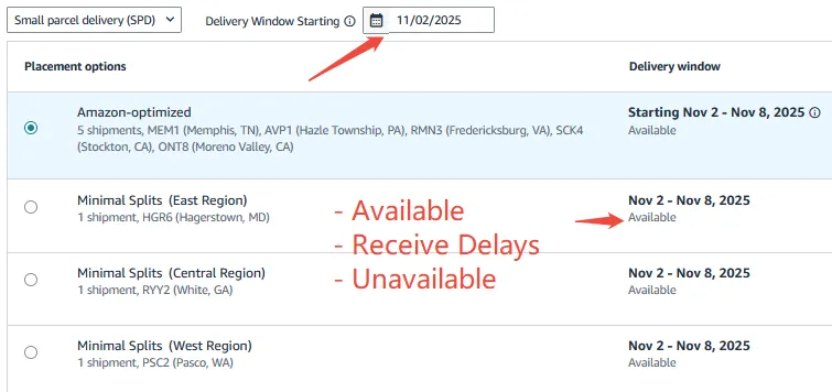 在您选择预计的送达时段后,系统会立即显示每个可选仓库在该时段的实时容量状态,分别标注为“可用”、“预计接收延迟”或“容量已满、无法接收”。