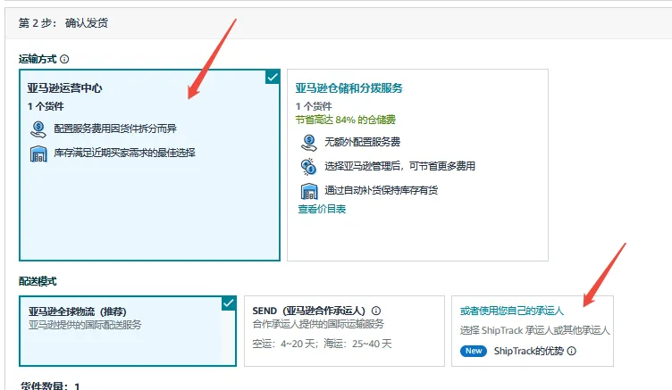 Step3:进入【入库配置选项】页面,选择运输方式(发送至亚马逊运营中心)和配送模式(使用您自己的承运人)