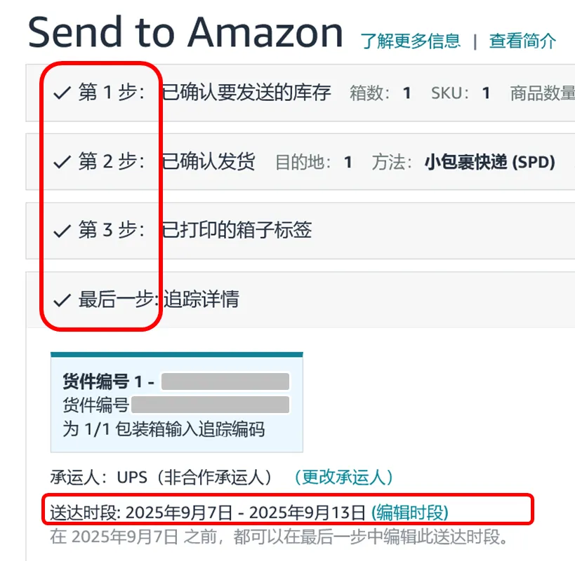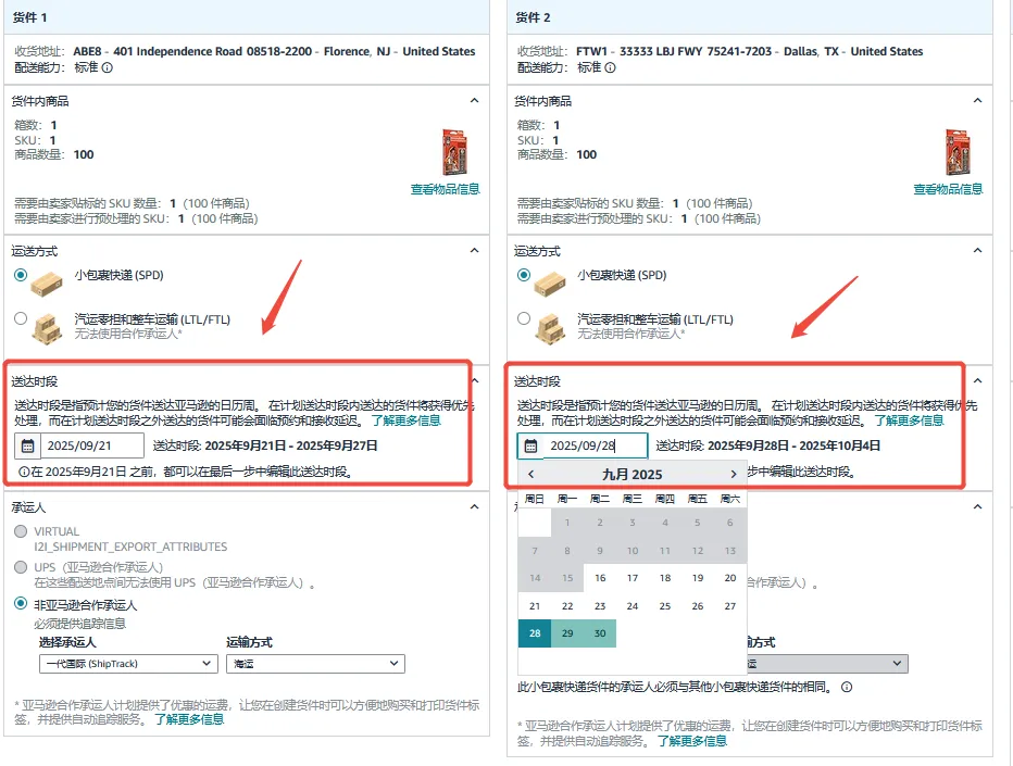Step5:为每个货件确认送达时段(Delivery Window),选择入库方案后,需为每个货件确认具体的预计送达时段。系统将默认你在前一步选择的送达时段。