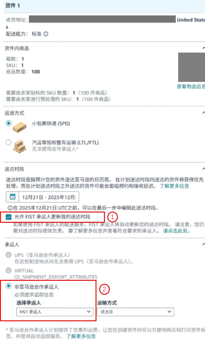 尽量避免选择标有延迟风险的入库区域和送达时段,如果您在第一步选择美国发货地址,此处还需选择承运人类型。如果选择PCP,则需提供发货日期,而不是送达时段。