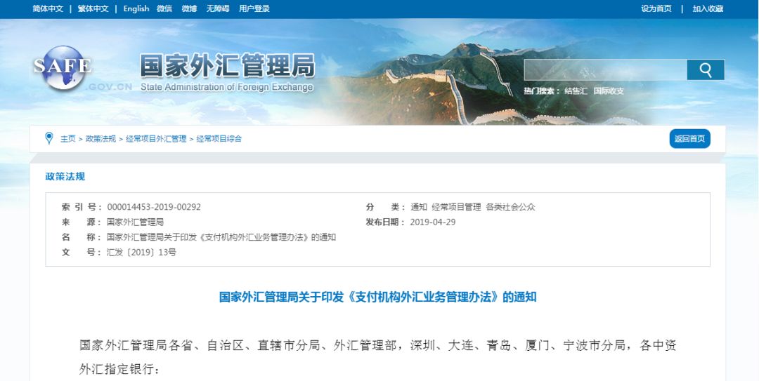 日前,在总结试点经验的基础上,国家外汇管理局发布《国家外汇管理局关于印发<支付机构外汇业务管理办法>的通知》(汇发〔2019〕13号,以下简称《通知》),在保持政策框架整体稳定不变的基础上,主动适应跨境电子商务新业态的业务特点,完善支付机构跨境外汇业务相关政策,进一步促进跨境电子商务结算便利化。