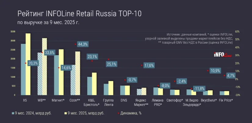 2025 年 1-9 月俄罗斯零售商 TOP 10 排名,数据来源:INFOLine
