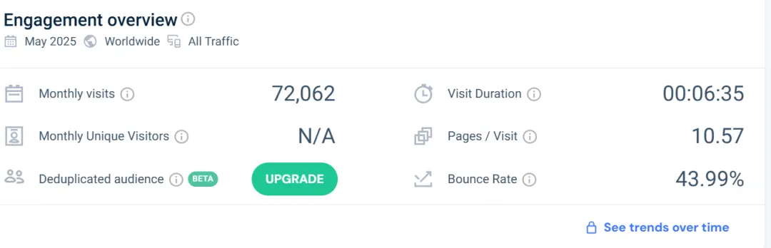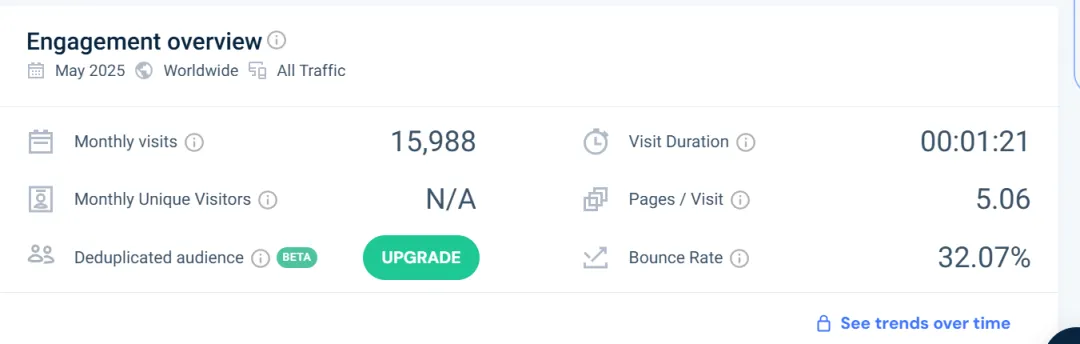 这个网站上个月获得了1.6万的访客,平均每天有500访客左右。虽然总体访问量不算特别高,但其跳出率极低,仅为 32%,说明用户对内容非常感兴趣,有较强的浏览黏性。