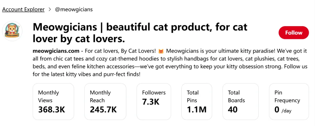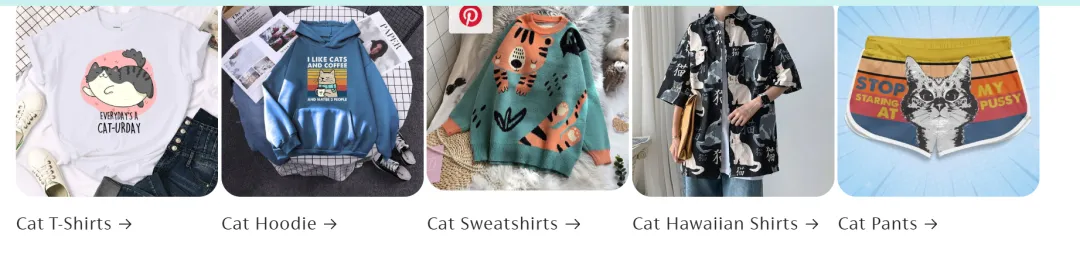 这个站点是一个以猫咪文化衍生产品为主题的创意独立站,通过 Pinterest 发布大量萌宠、插画风的内容吸引粉丝。