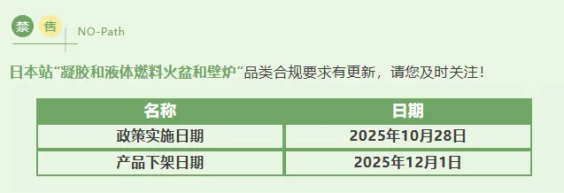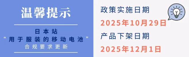 如果您在日本站销售“用于服装的移动电池”,请您及时关注个人邮箱以便接收到提醒邮件。若您错过提交合规文件的日期,产品将面临下架风险