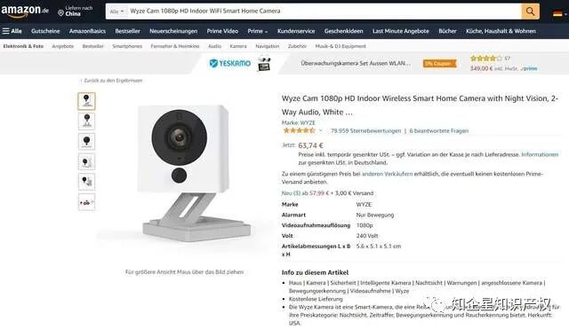 从亚马逊各站点截图来看,这款来自 Wyze Cam智能相机,同时霸占美国、英国#1 Best Seller in Camera & Photo,在美国站留评高达8.3W,售价25.98美金;在英国站留评高达7.9W,售价58.49英镑;在德国站留评达7.9W,售价63.74德国马克,可以说是亚马逊绝对的神仙产品了!