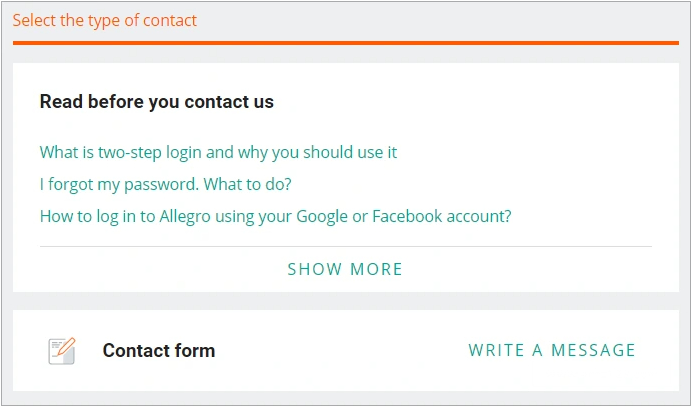 但是,如果Allegro帮助文章没有解决您的问题,可以通过联系表与Allegro联系。为了做到这一点,请点击【WRITE A MESSAGE】。当Allegro添加新的联系表格时,你会在下面显示的窗口中看到它们。