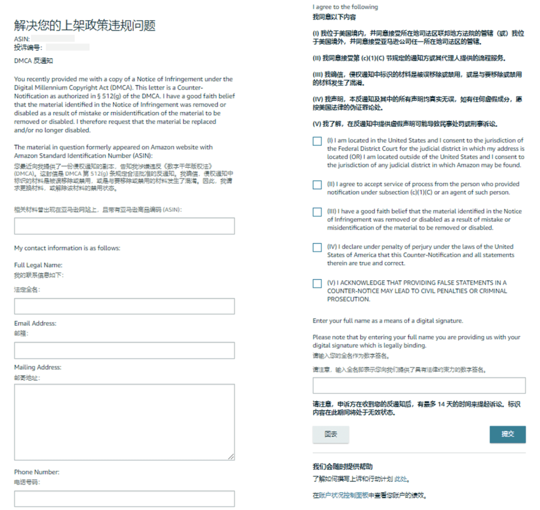 反通知模板中包含商品的ASIN No., 法人姓名,电子邮箱,通讯地址, 电话号码, 电子签名等,以避免被不法人士滥用。同时,卖家在提交表格时可以选择语言偏好。