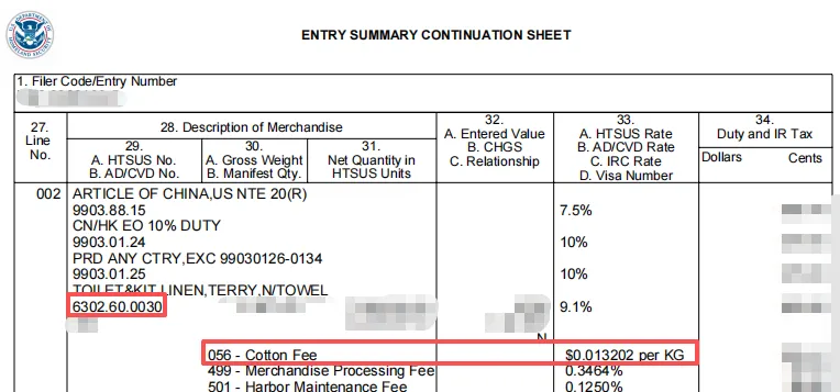 【美国进口清关】税金单 7501 表格上的棉花评估费(Cotton Fee)是什么意思?