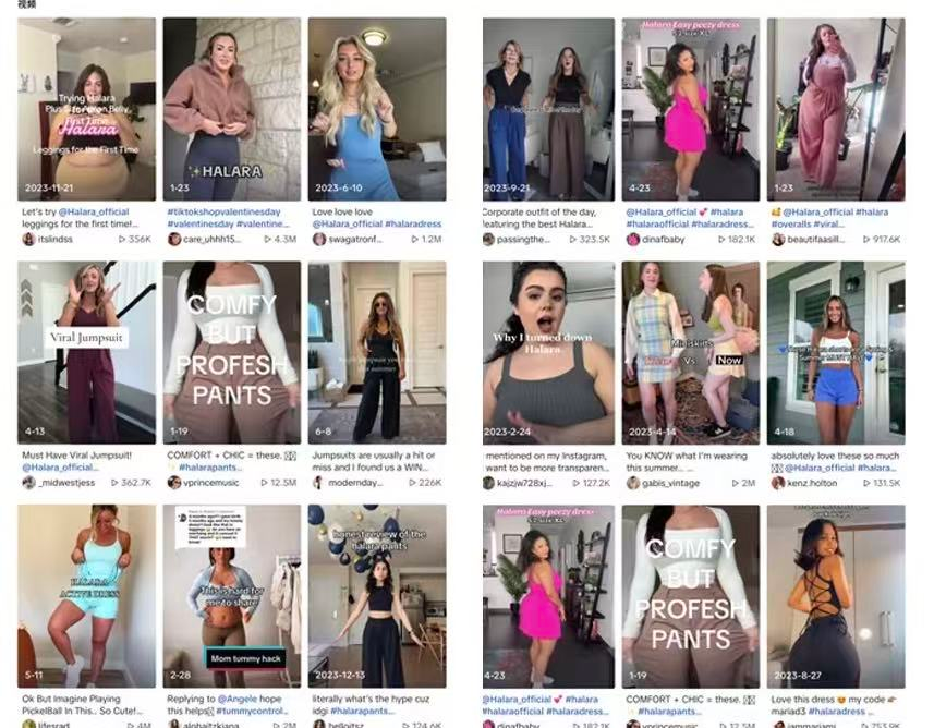 而在 TikTok 之外,品牌还巧妙布局 Pinterest 与 YouTube 两大平台:利用 Pinterest 的 “视觉搜索” 属性,发布穿搭灵感内容吸引用户主动检索,实现精准引流;在 YouTube 上则联合网红推出详细的产品评测与穿搭分享视频,通过 “沉浸式体验” 内容增强用户信任感,进一步扩大品牌影响力。这种 “主平台引爆 + 多平台补位” 的流量策略,让 Halara 在短时间内快速积累了大量精准用户,为后续增长奠定了坚实基础。