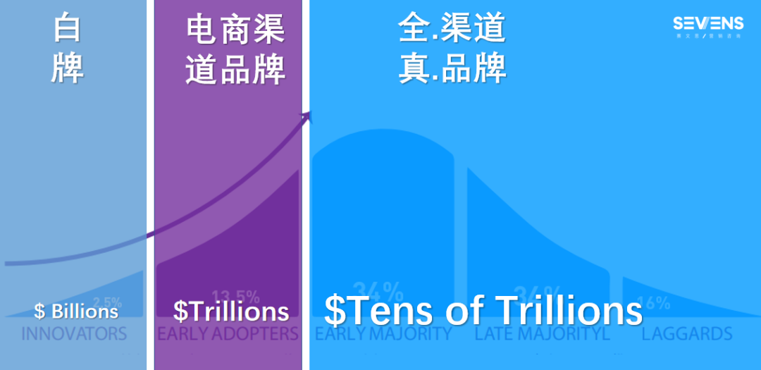 白牌阶段就是innovator创新者的一个阶段,它只占整个2%的这么一个生意,所以那个时候的交易额就是几十亿美元,几百亿人民币大概这样一个规模。