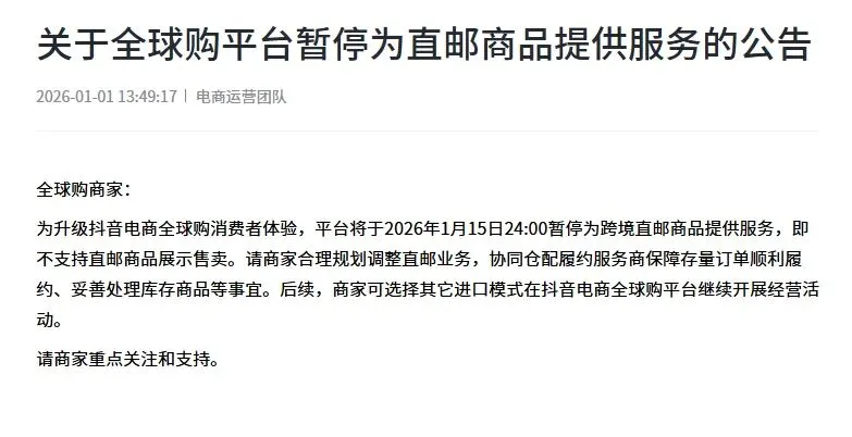 跨境电商的本质是连接全球供给与消费需求的数字化桥梁,其核心竞争力始终建立在服务质量与信任体系之上。抖音全球购暂停直邮服务的举措,是平台主动拥抱行业变革、践行高质量发展理念的重要实践。随着替代进口模式的不断完善与行业生态的持续优化,跨境电商将真正实现"正品直达、服务升级"的核心价值,为构建国内国际双循环相互促进的新发展格局注入更强动力。