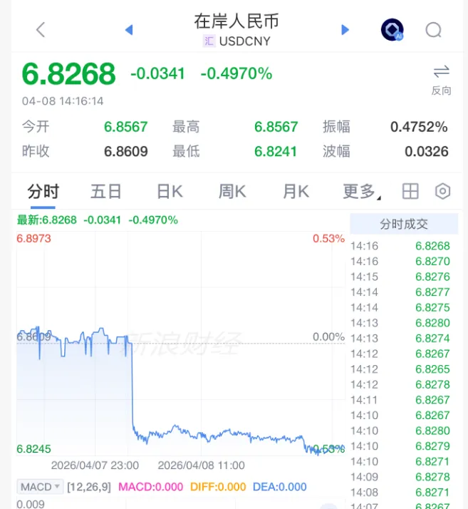 4月8日,人民币汇率表现强势。在岸人民币兑美元收盘报6.8274,单日大涨323点;离岸人民币兑美元盘中一度升破6.82关口,创出近三年新高。