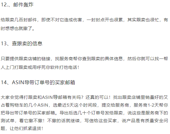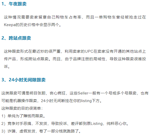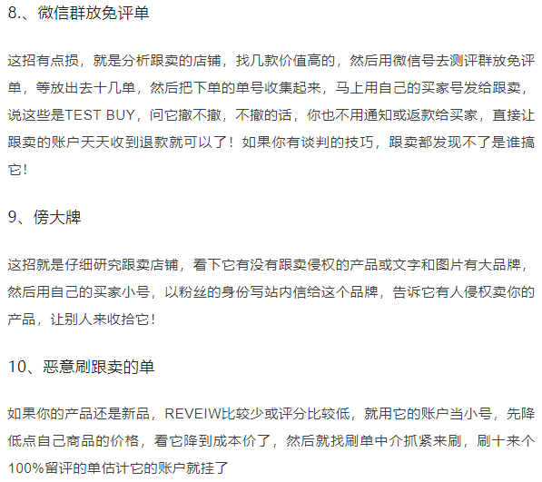 半夜偷偷改下LISTING详情或替换掉产品的图片 ,然后暂停销售自己的产品,当然前提是产品要有销量,这样让跟卖不知不觉中卖出几十单,肯定就有自然买家投诉它货不对板了,自然它就被暂停销售LISTING了!