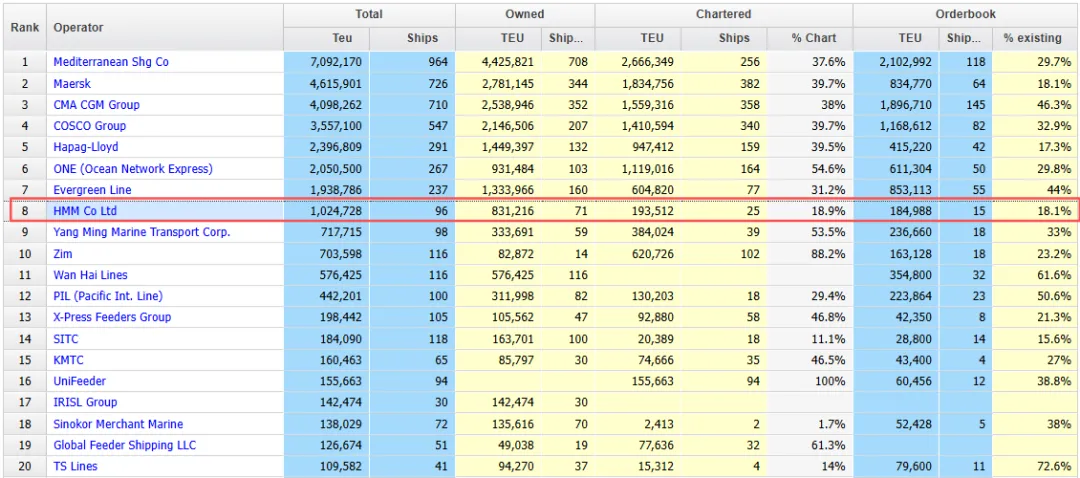 当前,HMM在全球集装箱班轮中排名第八,运力超102万标准箱,运营船舶96艘,其中自有船舶71艘,租赁船舶25艘,还有在建订单船舶15艘,运力达18.4万标准箱。