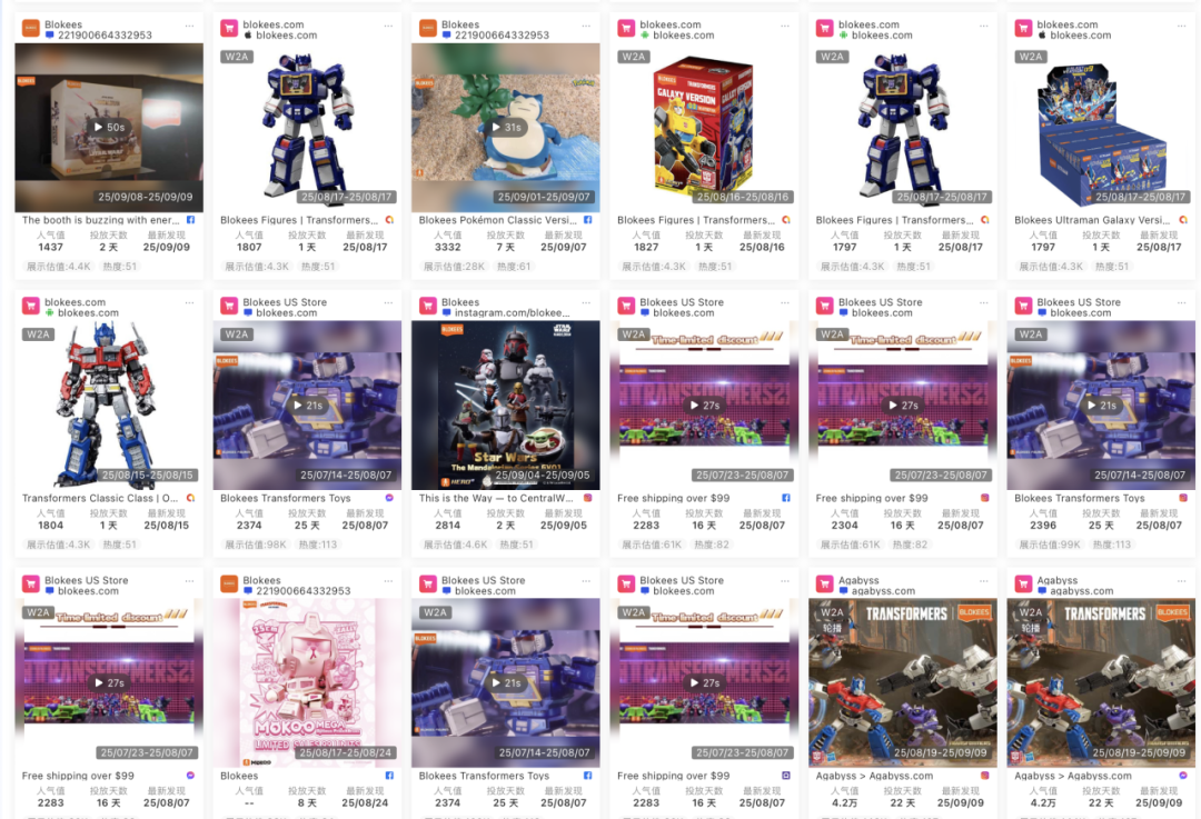 投放方面。根据BigSpy数据显示,布鲁可于8月初开始投放,目前还在试水阶段,投放量较少。投放兼有视频和图片格式,其中视频形式多为授权IP的动作展示和打斗场面,以此吸引消费者。