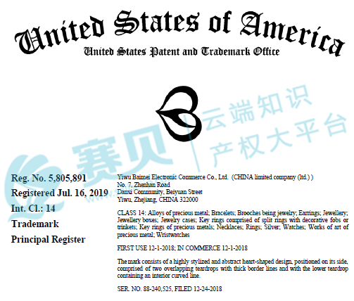 本案涉及一美国图形商标,注册号 5,805,891,2019 年 7 月 16 日注册,属第 14 类商品,涵盖贵金属合金、手镯、胸针(珠宝)等众多珠宝饰品及相关物品。该商标为高度风格化抽象的侧卧心形设计,由两个重叠泪滴构成,有粗边框线,下部泪滴含内部曲线。