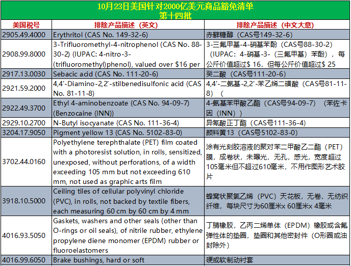公告下载地址:https://ustr.gov/sites/default/files/enforcement/301Investigations/%24200_Billion_Exclusions_Granted_October.pdf