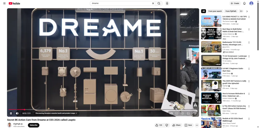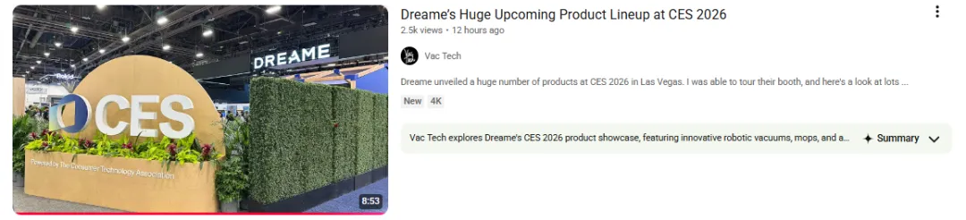 长尾效应延续展会热度:CES现场流量集中但周期短,而销售转化多在展后数周甚至数月。YouTube的评测视频会长期占据“追觅CES新品”“Dreame 2026 new products”等相关搜索结果,持续产生自然流量,将展会的短期热度转化为长期转化势能,成为展后营销的“决策基础设施”。