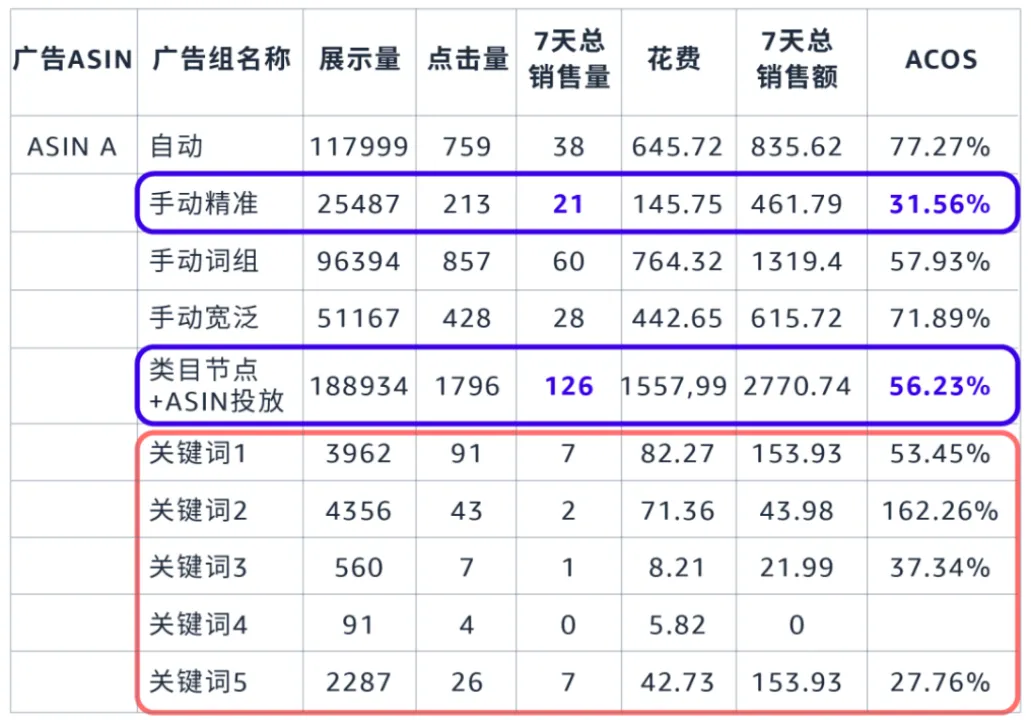 查看ASIN在同一个自动广告中,不同匹配方式的表现并优化。