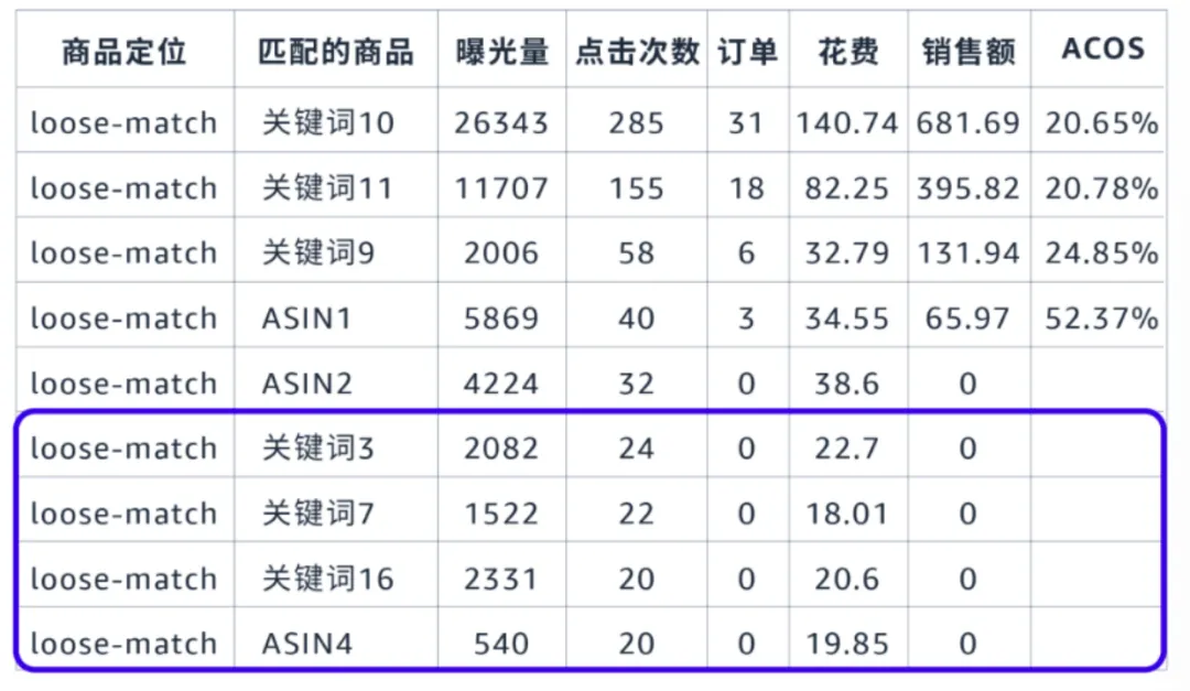 总之,当自动广告某一种匹配方式的ACOS较高时,我们可先分析在该匹配方式下,是否存在部分关键词占了较多的无效广告花费。直接“一刀切”来降低整个匹配方式的竞价,并不是理想的优化方式。