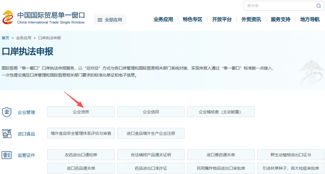 用户打开浏览器输入 http://www.singlewindow.cn 登录中国国际贸易单一窗口,在【业务应用】选择【口岸执法申报】。