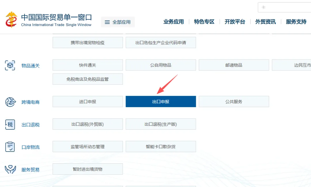 在口岸执法申报页面找到【跨境电商】点击【出口申报】。