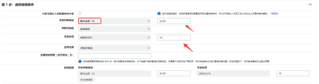 在卖家所购商品模块的下拉框选择“最低金额” , 金额填写我们商品的售价,然后在 “买家获得”选项卡下选择“减免折扣%”填写我们所需要的折扣力度。 具体操作细节如下: