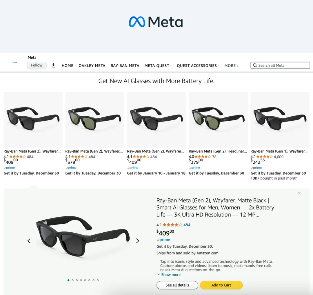 2025年三季度,Meta发布了第二代Meta雷朋智能眼镜。要找好的渠道放量销售,Meta竟然在广告领域的两个对手经营的电商平台,亚马逊和TikTok Shop,都上架了。