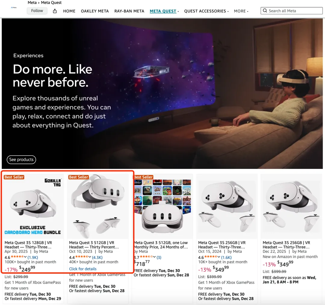 在亚马逊,Quest 3和Ray-Ban Meta,各自有一个品牌店铺。