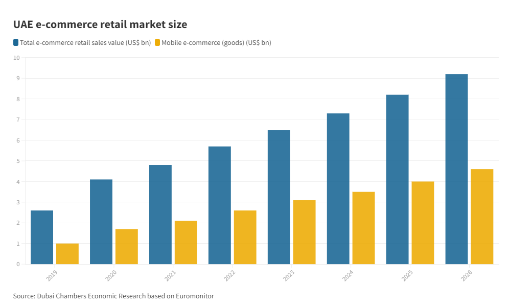 根据迪拜商会的一项研究发现,阿联酋的电子商务市场预计到 2026 年会达到92亿美元,比2021年增⻓近92%。根据相关数据估计,超过三分之一的阿联酋消费者每周至少使用智能手机购买一次商品或服务,高于全球平均每周在线购买量。