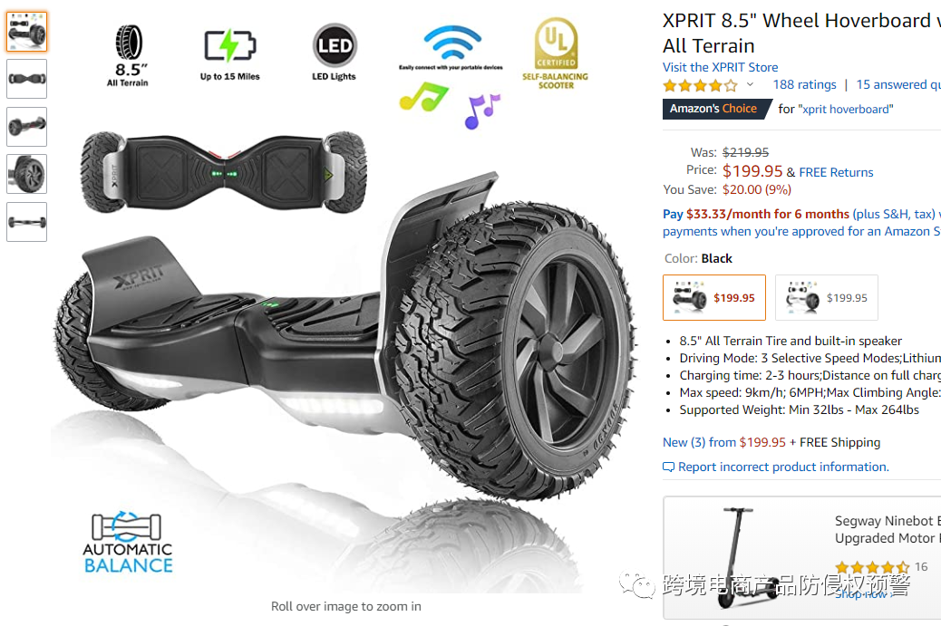 下面这款平衡车,目前它是亚马逊美国站的Amazon's Choice,留评188: