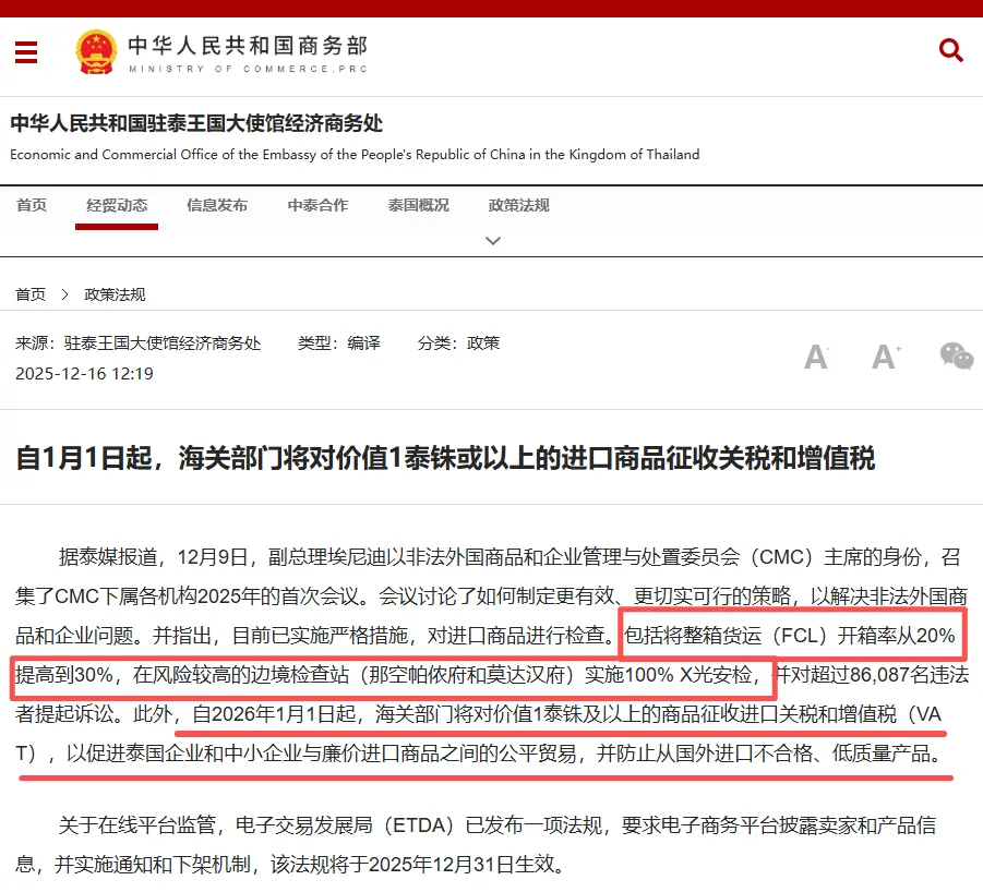 据报道,泰国副总理埃尼迪近日主持2025年首次CMC会议,会上指出泰国已实施严格进口商品检查措施,包括提高整箱货运开箱率(从20%提高到30%)、在部分边境检查站100%X 光安检,还决定自 2026年1月1日起对价值1泰铢及以上商品征收进口关税和增值税,以促进公平贸易、防止进口不合格低质产品,此举几乎涵盖泰国所有进口商品。