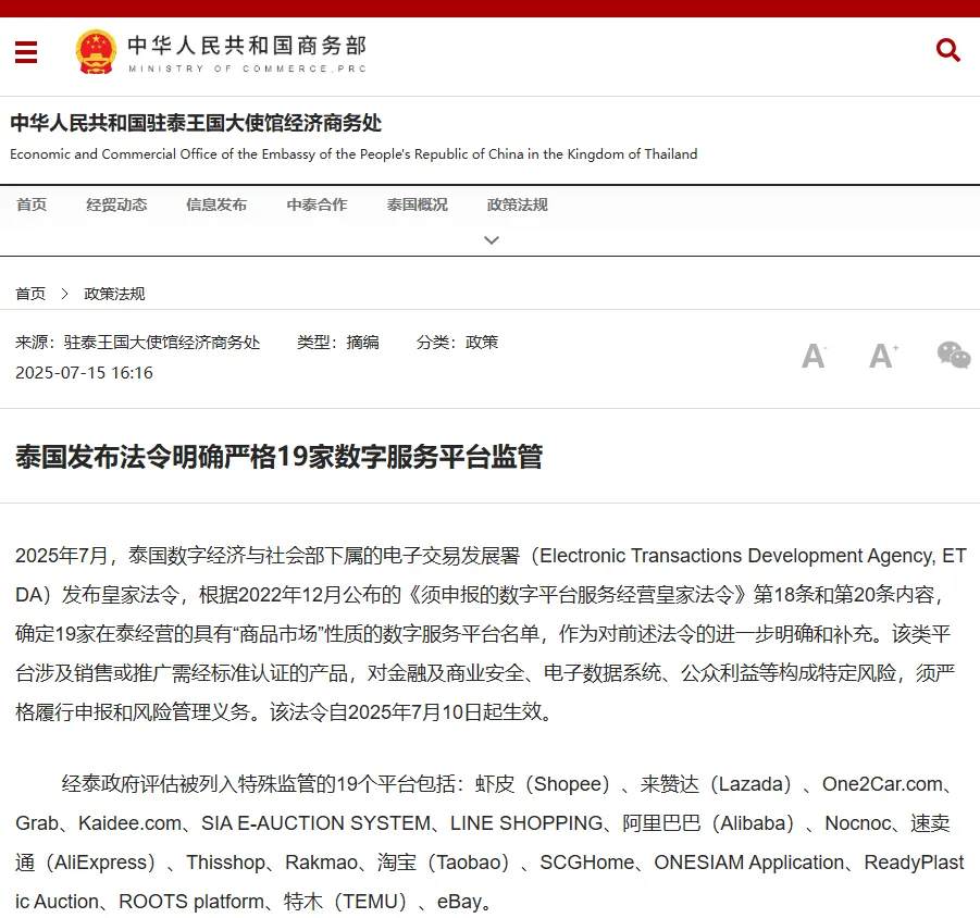 对特定平台提出监管要求:今年7月,泰国对19家具有“商品市场”性质的数字服务平台提出监管要求,其中包括收集卖家信息,并在销售或推广前检查商品的相关资质。这类平台涵盖Shopee、Lazada、TEMU等。