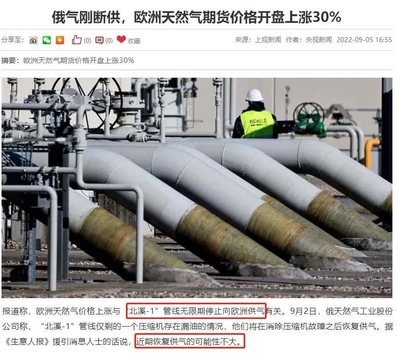 在寒冷的欧洲,天然气是使用最广泛的取暖方式。俄罗斯是欧洲最大的天然气供给地。截止去年,欧洲有40%的天然气从俄罗斯进口。9月2日,俄罗斯天然气工业股份公司宣布全面暂停北溪1号供气。