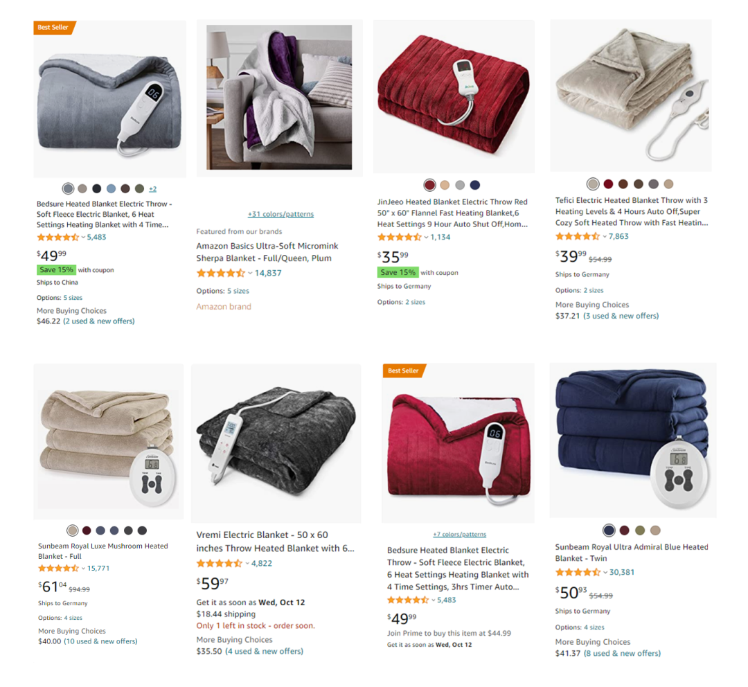 在亚马逊平台上,大部分电热毯的价格五十美元左右,也有价格高达上百美元。除了电热毯以外电取暖器的销量也迅速增长,这些取暖设备绝大部分来自中国。
