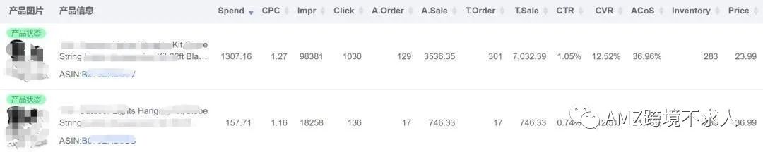 上图:产品一花钱多,ACoS 高,产品二花钱少,ACoS 低;