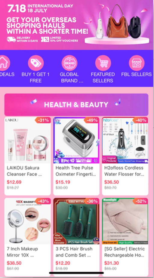 八月新加坡站点将在首页开放FBL跨境商品专属页面入口,消费者可在专区中购买到平台优选的海外仓跨境商品,极速送达。对于商家而言,入仓后的跨境商品也将有更多曝光机会,同时还可配合跨境专属活动,提高店铺转化,GMV暴涨!