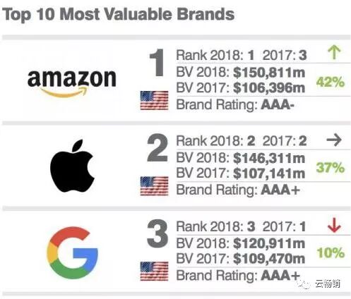 报告显示,亚马逊成为2018年美国最具价值品牌,长期排名第一的苹果丢失冠军宝座,屈居第二。亚马逊的品牌价值攀升了42%,达到1508亿美元,排名美国第一。